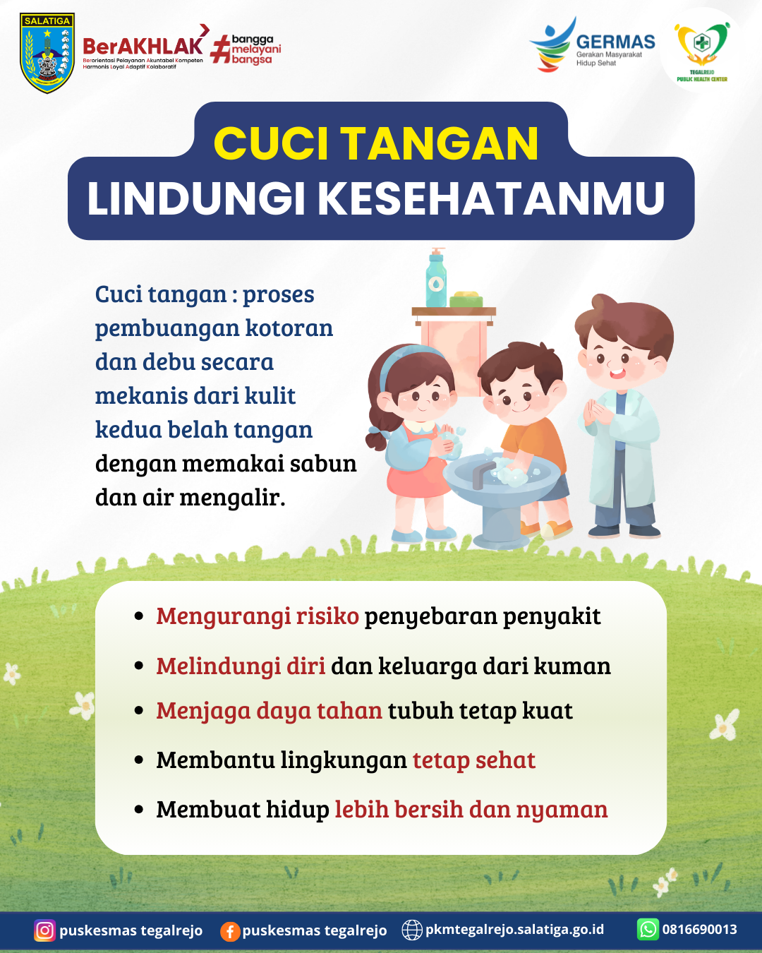 Mari biasakan cuci tangan pakai sabun sebelum dan sesudah beraktivitas. Karena langkah kecil hari ini dapat melindungi kesehatan kita bersama. ✨
