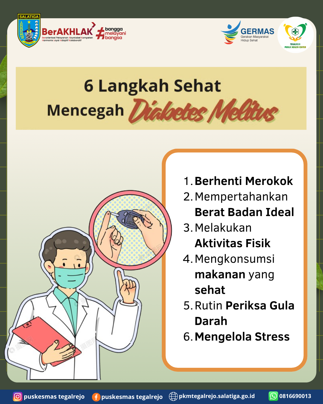 💙 Cegah Diabetes Mulai dari Sekarang! Diabetes melitus bisa dicegah dengan langkah sederhana yang bisa kita lakukan setiap hari. Yuk, mulai gaya hidup sehat dari sekarang! ✨ 6 Langkah Sehat Mencegah Diabetes: 🚭 Berhenti merokok⚖️ Pertahankan berat badan ideal🏃♂️ Rutin aktivitas fisik🥗 Konsumsi makanan sehat🩸 Cek gula darah secara rutin😌 Kelola stres dengan baik Tidak…