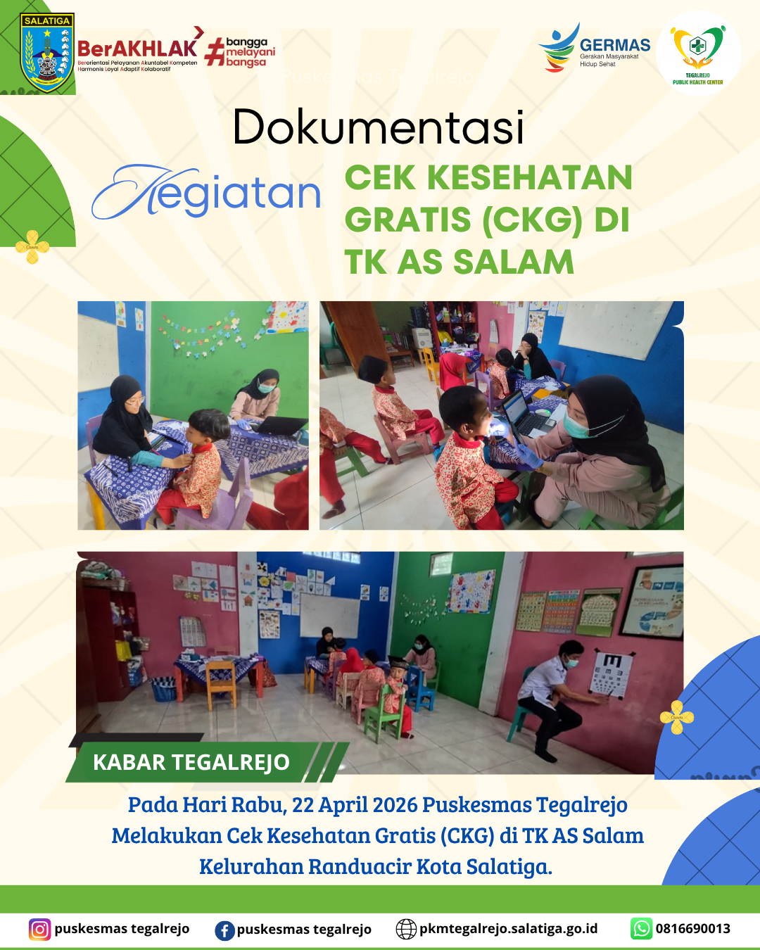 Pada Hari Rabu, 22 April 2026 Puskesmas Tegalrejo Melakukan Cek Kesehatan Gratis (CKG) di TK AS Salam Kelurahan Randuacir Kota Salatiga.