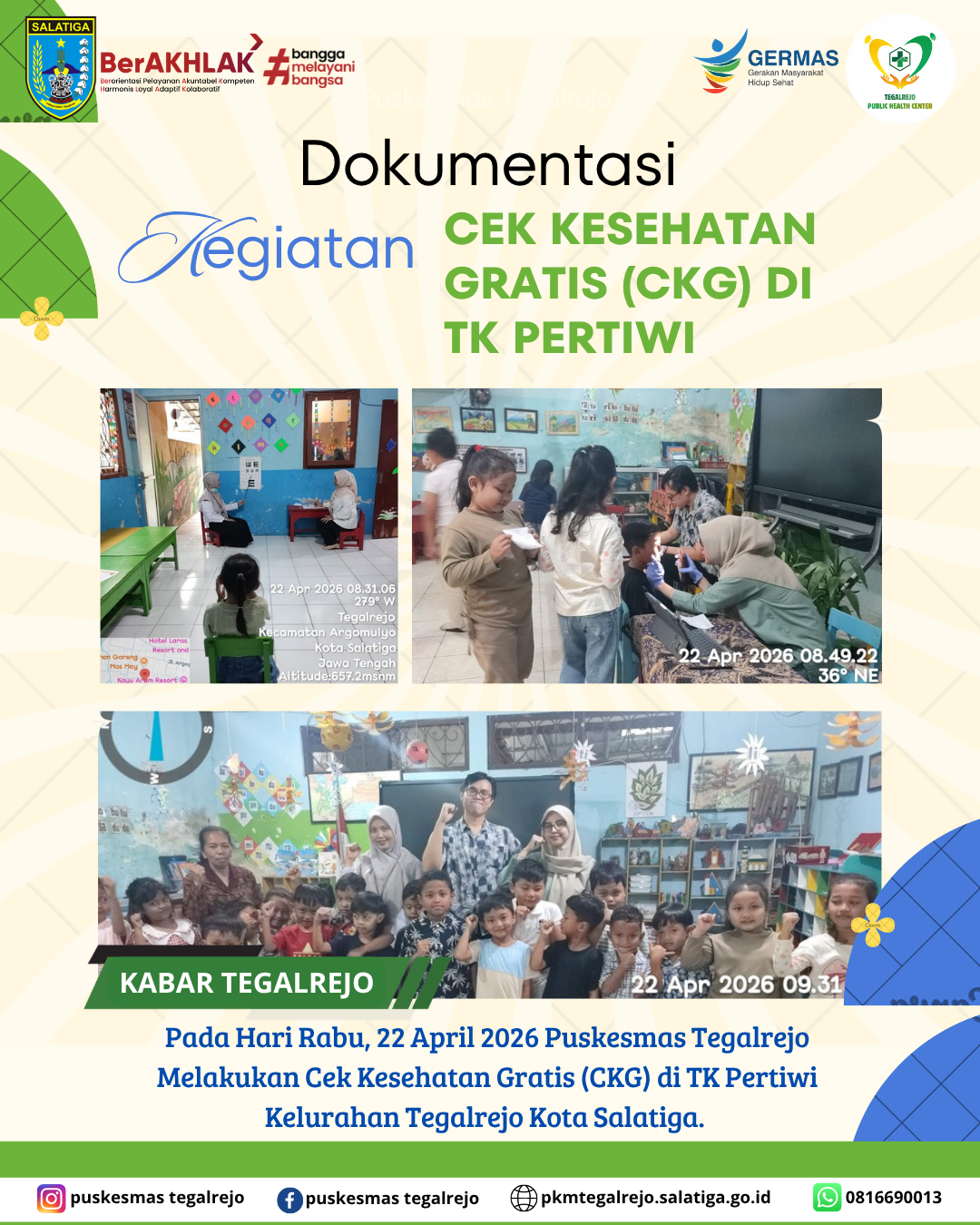 Pada Hari Rabu, 22 April 2026 Puskesmas Tegalrejo Melakukan Cek Kesehatan Gratis (CKG) di TK Pertiwi Kelurahan Tegalrejo Kota Salatiga.