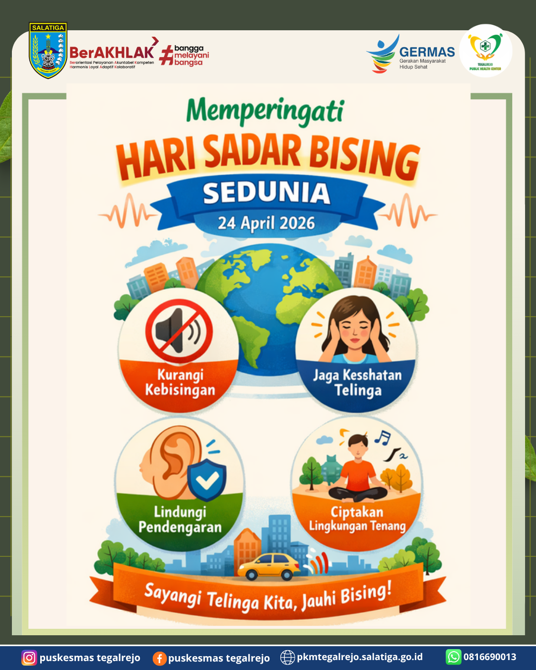🌍🔊 Memperingati Hari Sadar Bising Sedunia📅 24 April 2026 Kebisingan bukan sekadar gangguan, tapi bisa berdampak pada kesehatan kita, terutama pendengaran 👂 Yuk mulai langkah kecil dari sekarang:🔇 Kurangi kebisingan di sekitar kita👂 Jaga kesehatan telinga🛡️ Lindungi pendengaran🌿 Ciptakan lingkungan yang lebih tenang Karena telinga kita berharga…💛 Sayangi telinga kita, jauhi bising! #HariSadarBisingSedunia#NoiseAwarenessDay#KesehatanTelinga#HidupSehat#PuskesmasTegalrejo