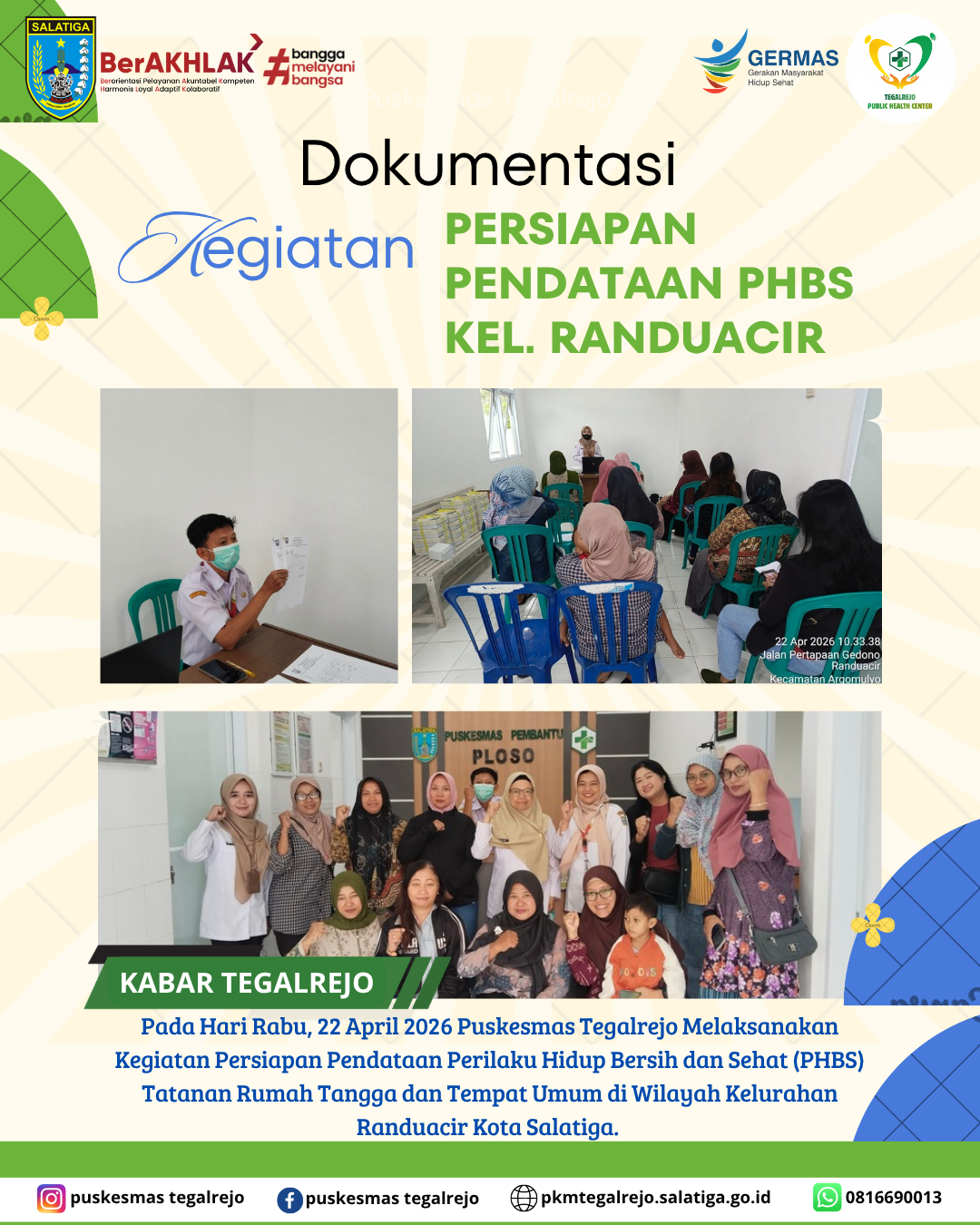 Pada Hari Rabu, 22 April 2026 Puskesmas Tegalrejo Melaksanakan Kegiatan Persiapan Pendataan Perilaku Hidup Bersih dan Sehat (PHBS) Tatanan Rumah Tangga dan Tempat Umum di Wilayah Kelurahan Randuacir Kota Salatiga.