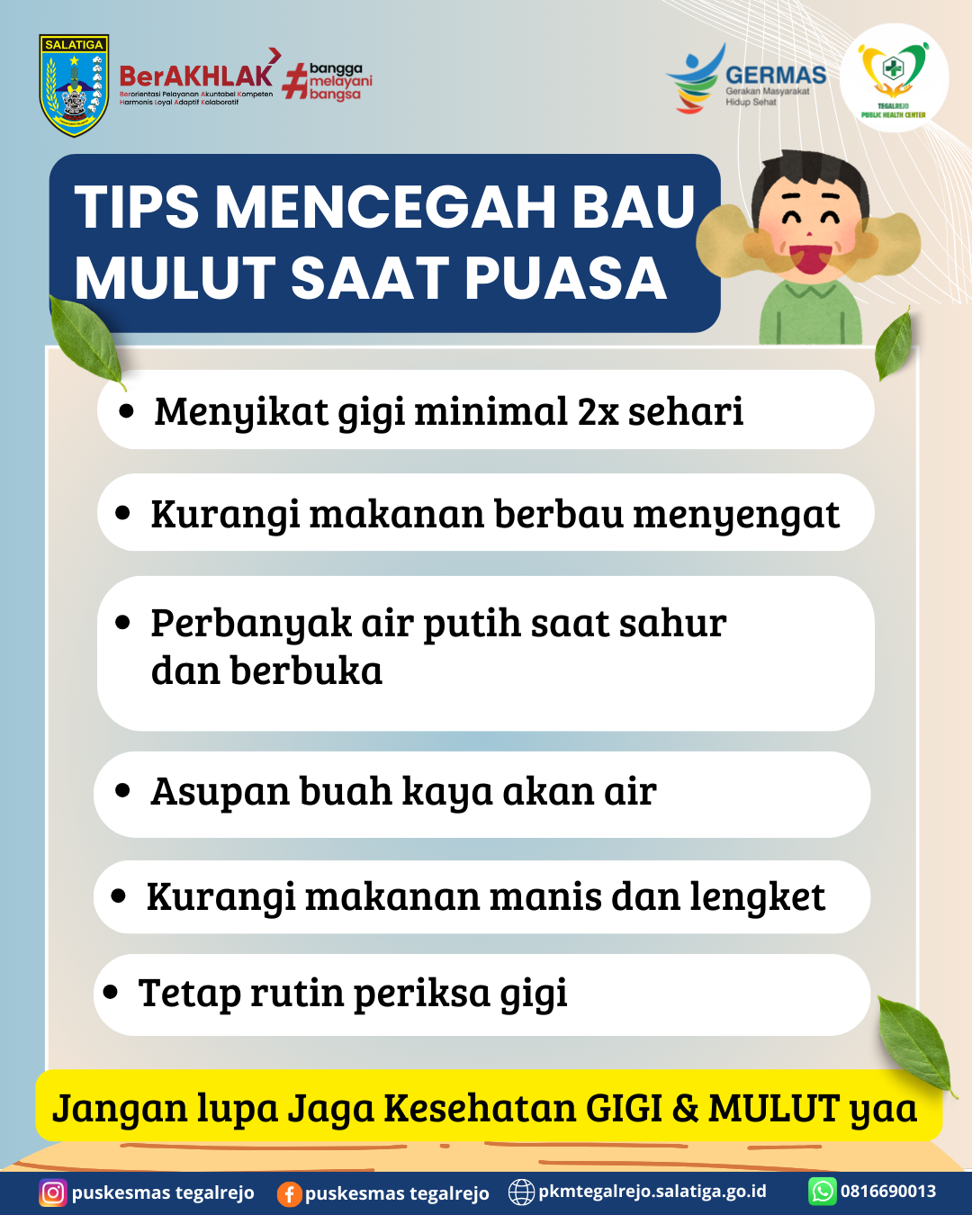 Yuk cegah bau mulut di bulan puasa biar tetap pede ngobrol tanpa harus tutup mulut pakai tangan 😷😂✨ Tips mencegah bau mulut saat puasa:🦷 Sikat gigi setelah sahur & sebelum tidur👅 Jangan lupa bersihkan lidah💧 Perbanyak minum air putih saat sahur & berbuka🥗 Konsumsi buah & sayur🚫 Kurangi makanan berbau tajam (petai, jengkol, bawang mentah…