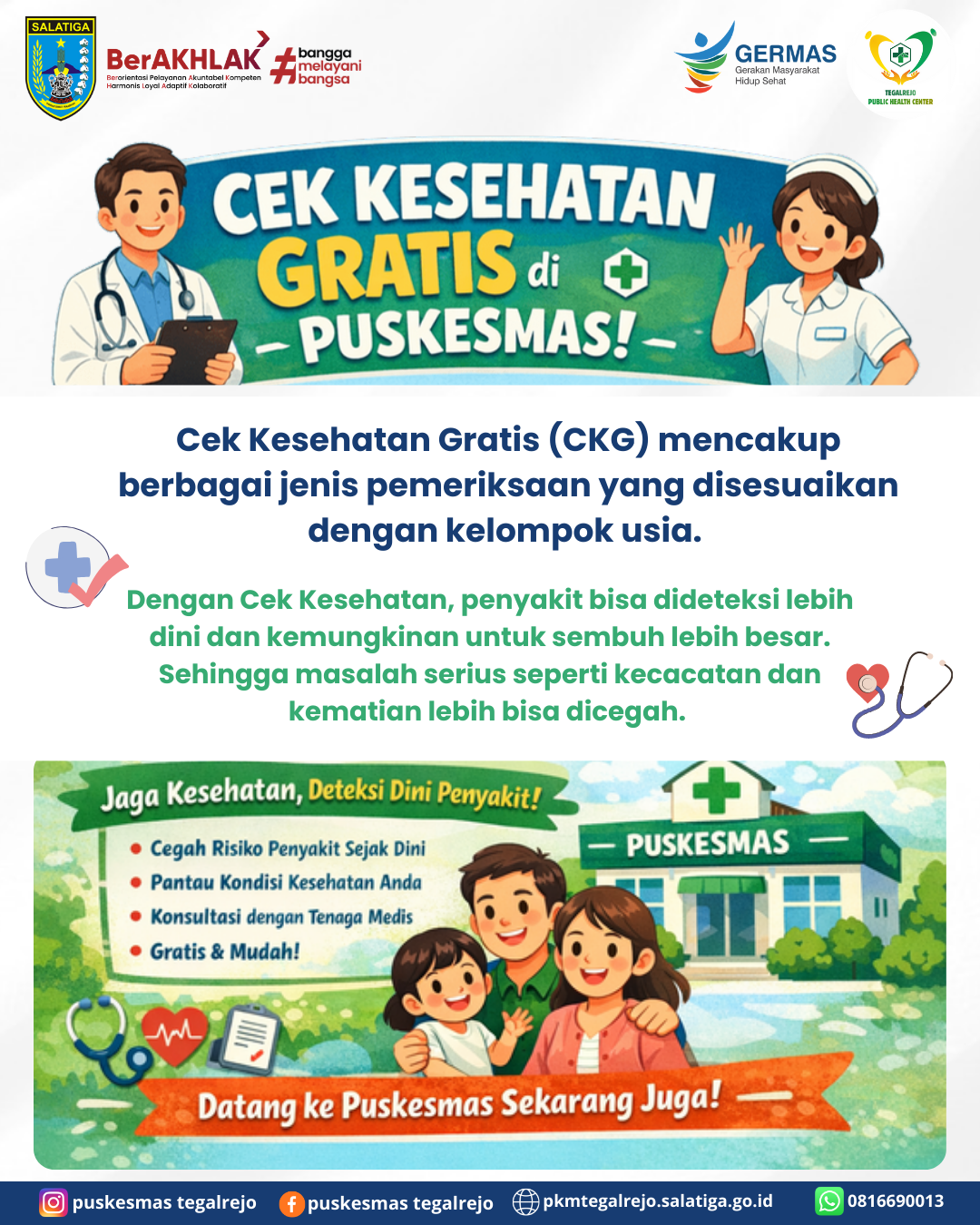 🩺✨ Cek Kesehatan Gratis (CKG) ✨🩺 Cek Kesehatan Gratis mencakup berbagai jenis pemeriksaan yang disesuaikan dengan kelompok usia.Melalui pemeriksaan rutin, penyakit dapat dideteksi lebih dini, sehingga peluang untuk sembuh menjadi lebih besar. Dengan CKG, kita bisa mencegah masalah kesehatan serius seperti kecacatan dan kematian sejak awal.Yuk, jaga kesehatan mulai sekarang—karena sehat adalah investasi terbaik 💙…