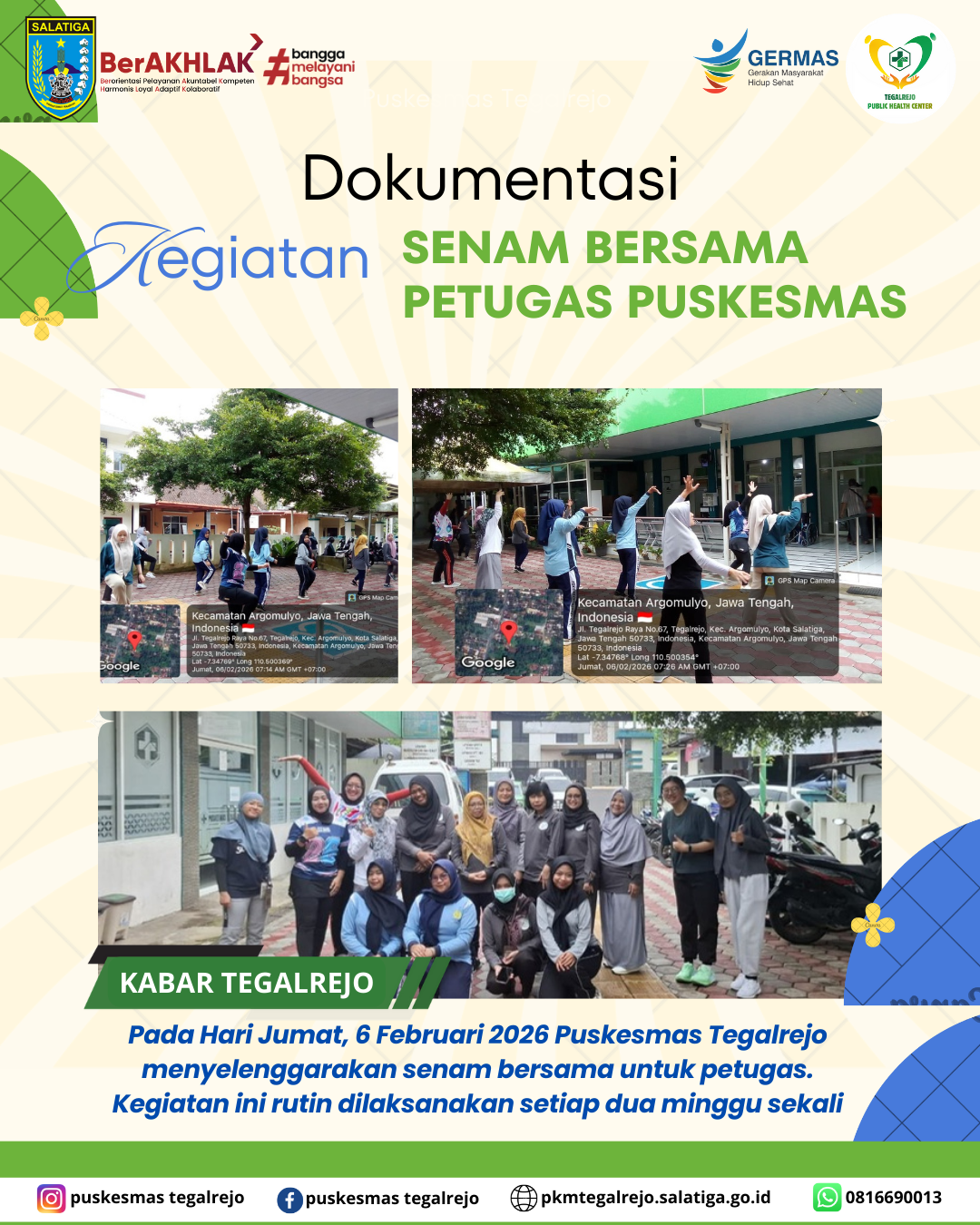 Pada Hari Jumat, 6 Februari 2026 Puskesmas Tegalrejo menyelenggarakan senam bersama untuk petugas. Kegiatan ini rutin dilaksanakan setiap dua minggu sekali.