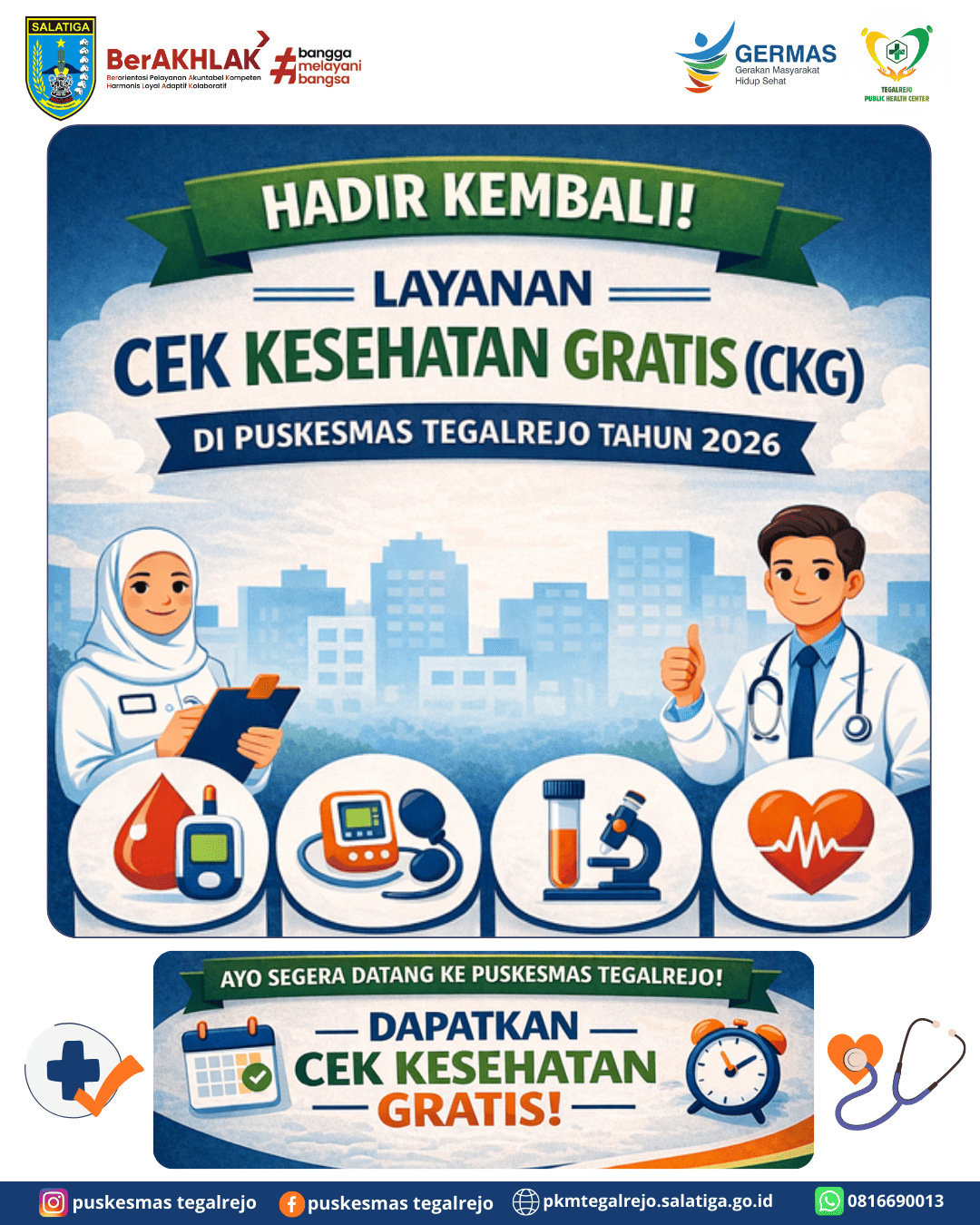 🎉 Kabar Baik untuk Masyarakat! 🎉 ✨ Cek Kesehatan Gratis di Puskesmas Tegalrejo hadir kembali di Tahun 2026! ✨Yuk, manfaatkan layanan ini untuk mengetahui kondisi kesehatan sejak dini 💙 🩺 Pemeriksaan kesehatan dilakukan oleh tenaga kesehatan profesional🎯 Deteksi dini, cegah penyakit, dan tingkatkan kualitas hidup 📍 Puskesmas Tegalrejo📆 Tahun 2026 Ayo datang dan ajak keluarga…