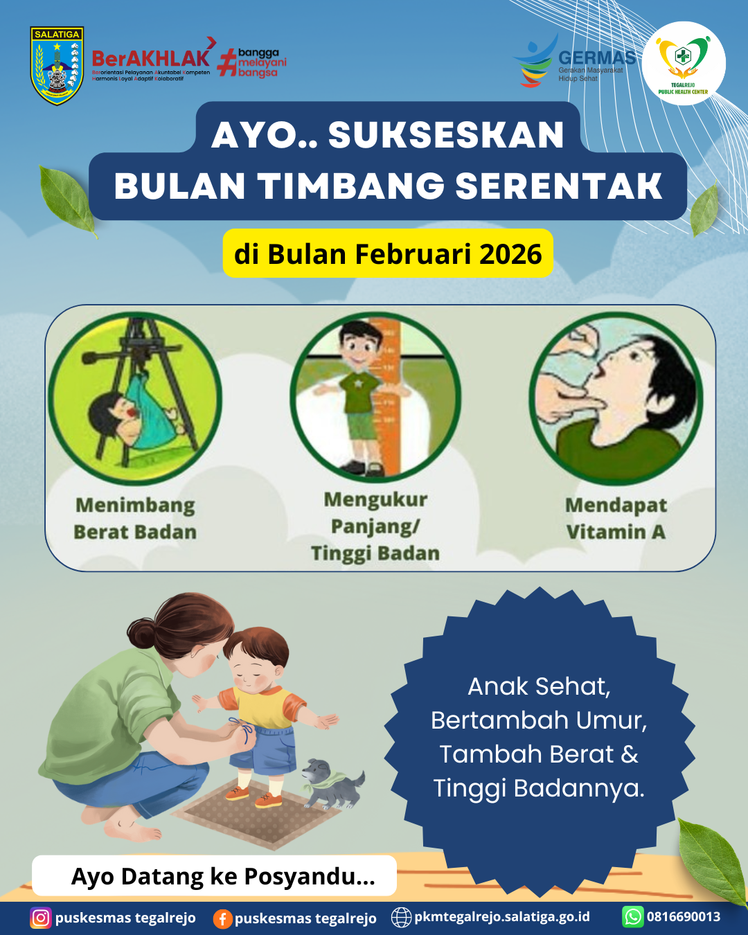 📣 Ayo Sukseskan Bulan Timbang Serentak! 📣Bulan Februari 2026 adalah waktunya orang tua hebat memastikan tumbuh kembang buah hati 💕Dengan menimbang dan mengukur tinggi badan balita secara rutin, kita bisa mencegah stunting sejak dini.👶⚖️ Datang ke Posyandu terdekat📆 Februari 2026🎯 Bersama kita wujudkan balita sehat, cerdas, dan kuat!✨ Jangan lupa ajak keluarga dan tetangga ya!Karena…