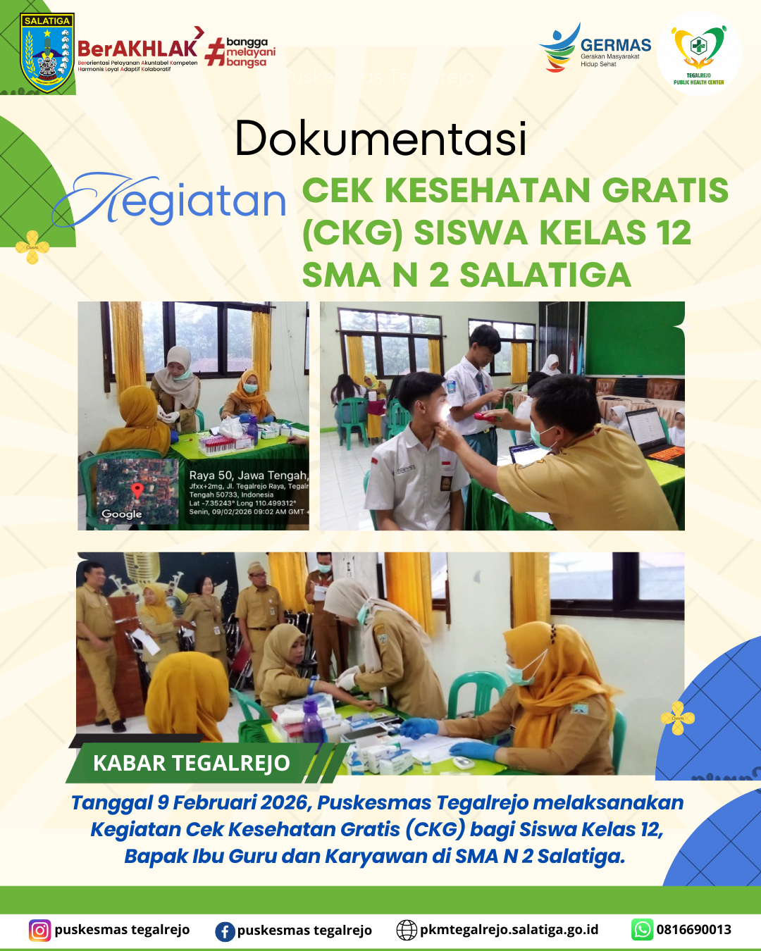 Tanggal 9 Februari 2026, Puskesmas Tegalrejo melaksanakan Kegiatan Cek Kesehatan Gratis (CKG) bagi Siswa Kelas 12, Bapak Ibu Guru dan Karyawan di SMA N 2 Salatiga.