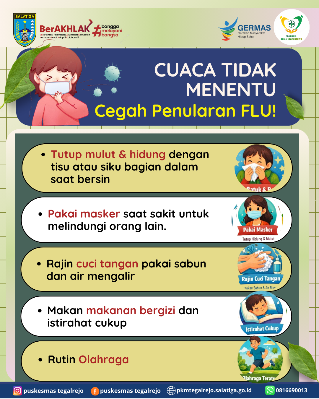 🌦️ Cuaca Tidak Menentu, Flu Mudah Menyerang! 🤧Perubahan cuaca yang ekstrem dapat menurunkan daya tahan tubuh dan meningkatkan risiko penularan flu.Yuk, lindungi diri dan orang-orang tercinta dengan langkah sederhana berikut: ✅ Rajin cuci tangan pakai sabun✅ Gunakan masker saat batuk, pilek, atau di tempat ramai✅ Konsumsi makanan bergizi & cukup minum air putih✅ Istirahat cukup…