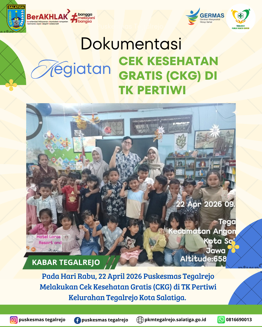 Pada Hari Rabu, 22 April 2026 Puskesmas Tegalrejo Melakukan Cek Kesehatan Gratis (CKG) di TK Pertiwi Kelurahan Tegalrejo Kota Salatiga.