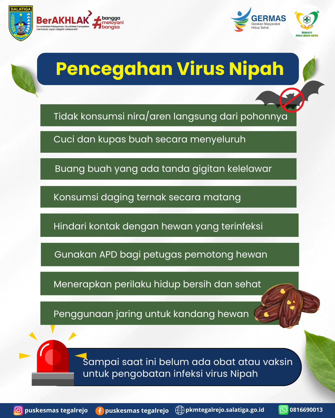 Sampai saat ini belum ditemukan kasus infeksi virus nipah di Indonesia. Namun, kita tetap harus waspada ya, karena sampai saat ini belum ada obat atau vaksin untuk pengobatan infeksi virus nipah☝️