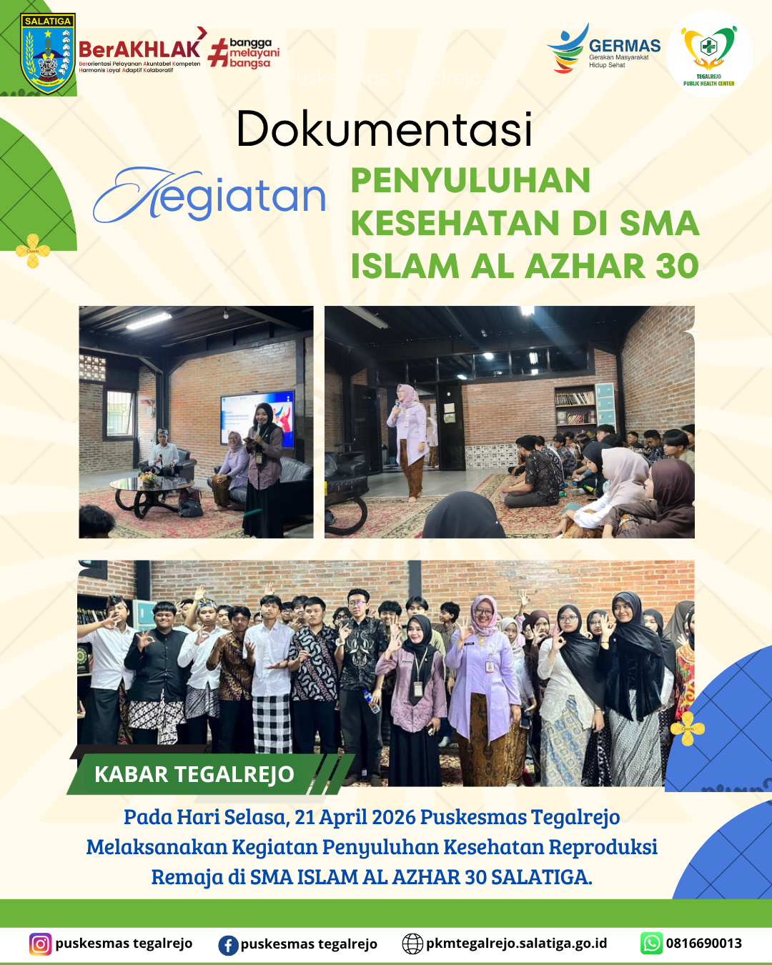 Pada Hari Selasa, 21 April 2026 Puskesmas Tegalrejo Melaksanakan Kegiatan Penyuluhan Kesehatan Reproduksi Remaja di SMA ISLAM AL AZHAR 30 SALATIGA.